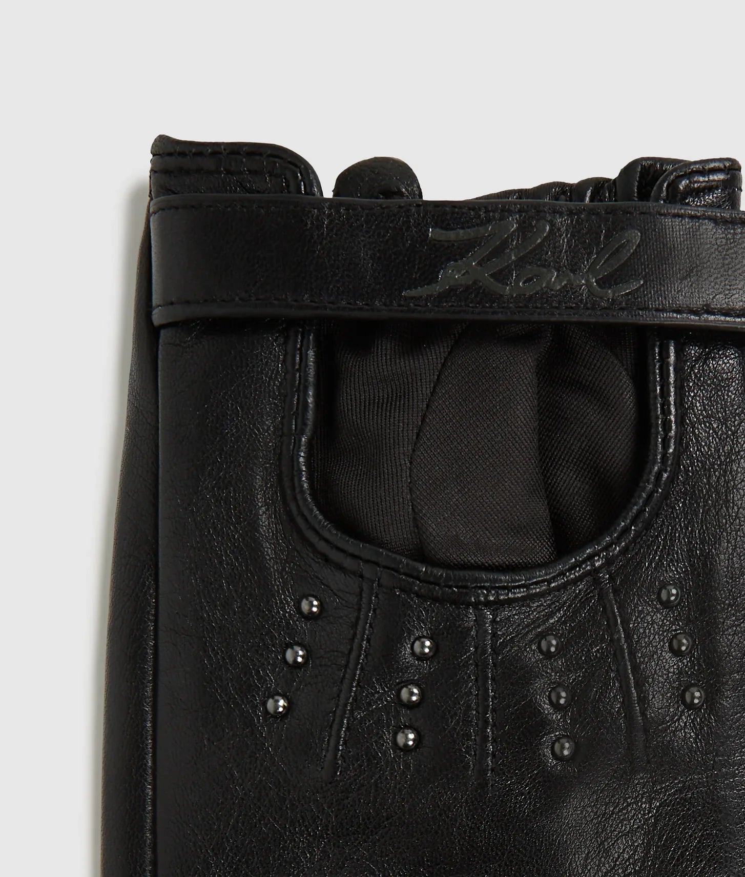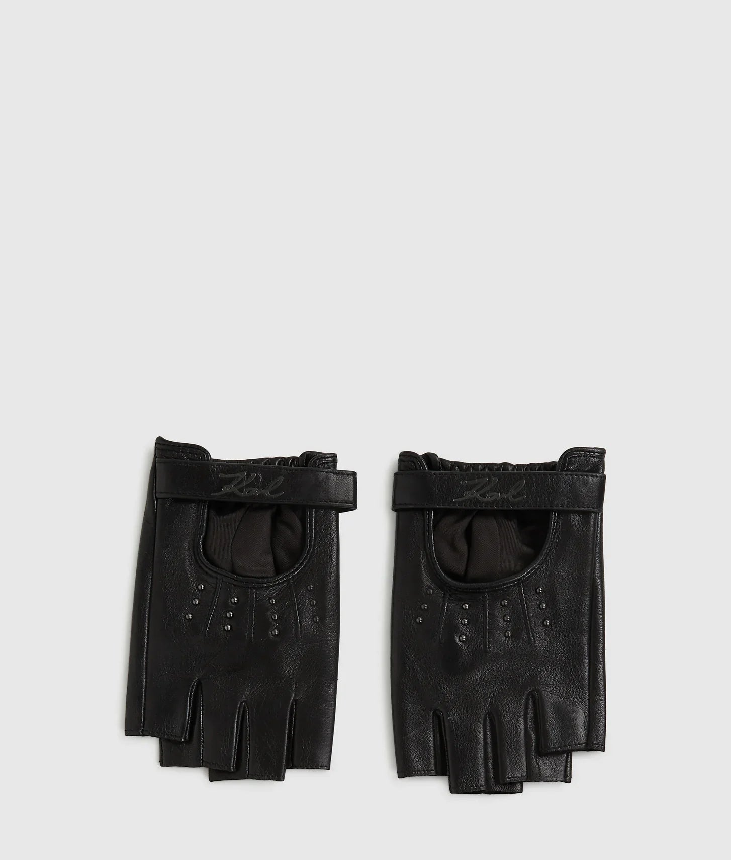 The fingerless silhouette allows for effortless movement and versatility, making them ideal for both everyday wear and statement styling. Stud embellishments add a striking, rebellious finish, while the elasticated cuffs ensure a secure, comfortable fit throughout the day. A tonal KARL Signature detail at the wrist strap subtly reinforces the brand’s iconic identity without overpowering the design.
