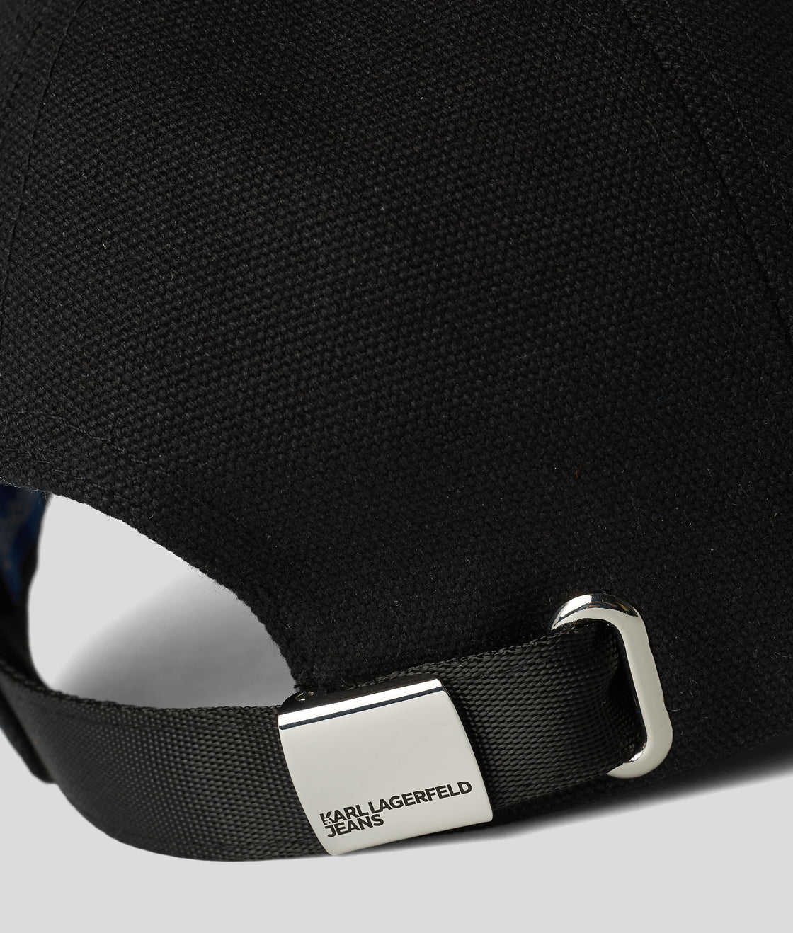 Clean lines, bold logo. The trademark KARL LAGERFELD JEANS box logo patch turns a classic baseball cap into a future icon.