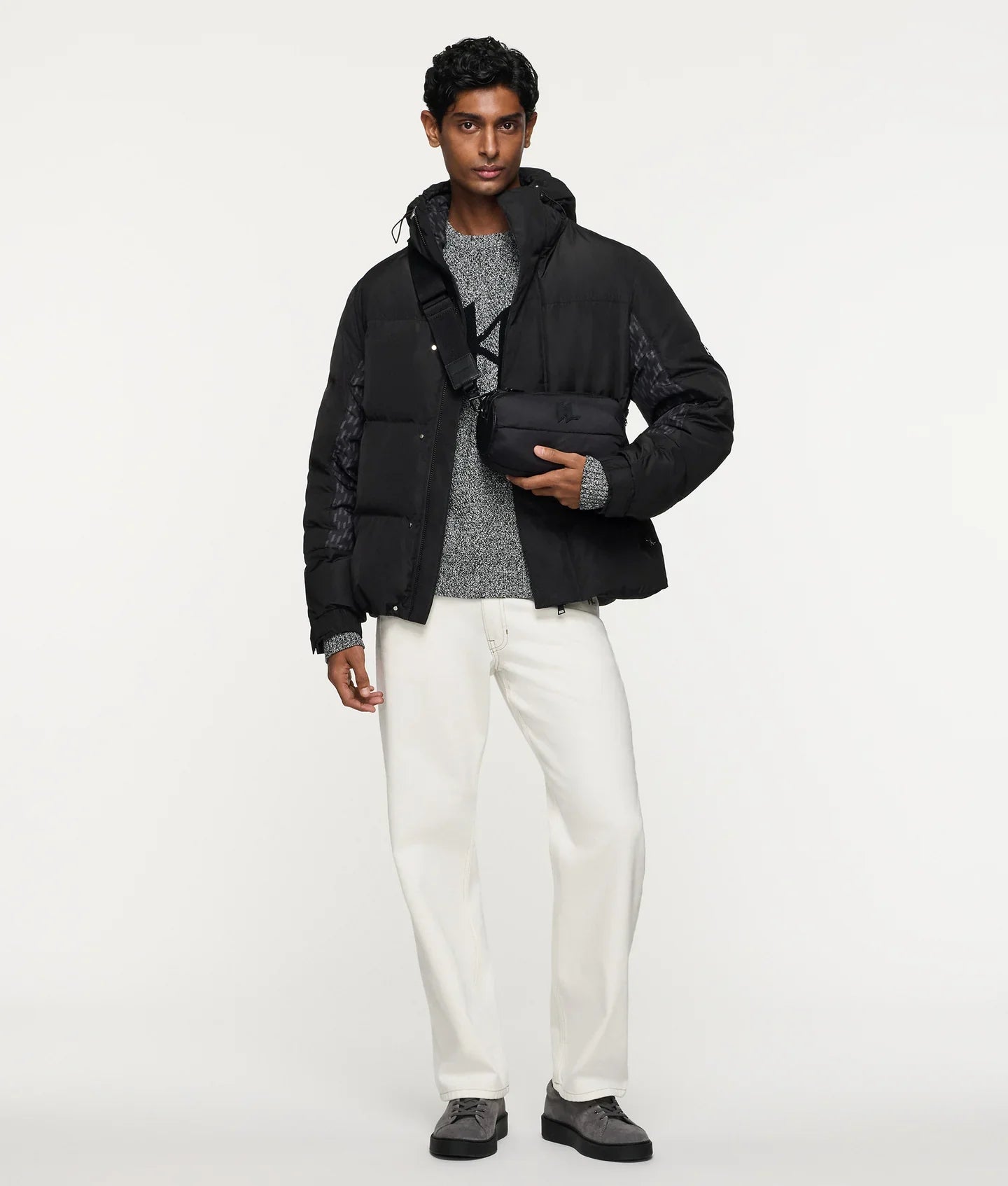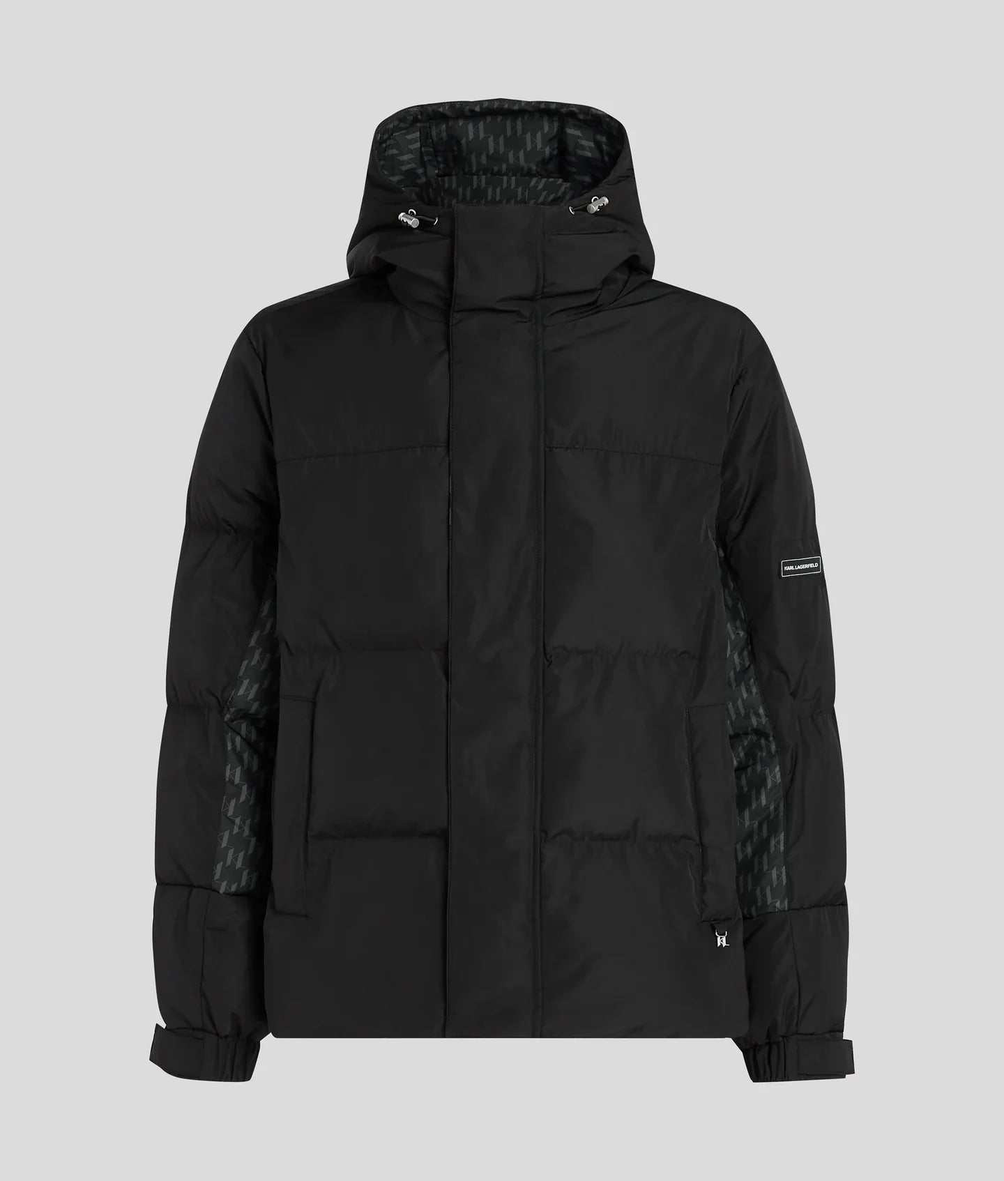 The jacket features a concealed front closure and a detachable hood for versatile styling and adaptability in changing conditions. Adjustable drawcords with branded stoppers at the hood and hem allow for a customizable fit, enhancing both warmth and silhouette. High-movement areas, including the inner arms and hood, are reinforced with textured Karl Monogram paneling, providing extra durability while adding a subtle, stylish detail. Signature branding is completed with a KARL LAGERFELD patch at the left sleeve, delivering a refined, iconic accent.