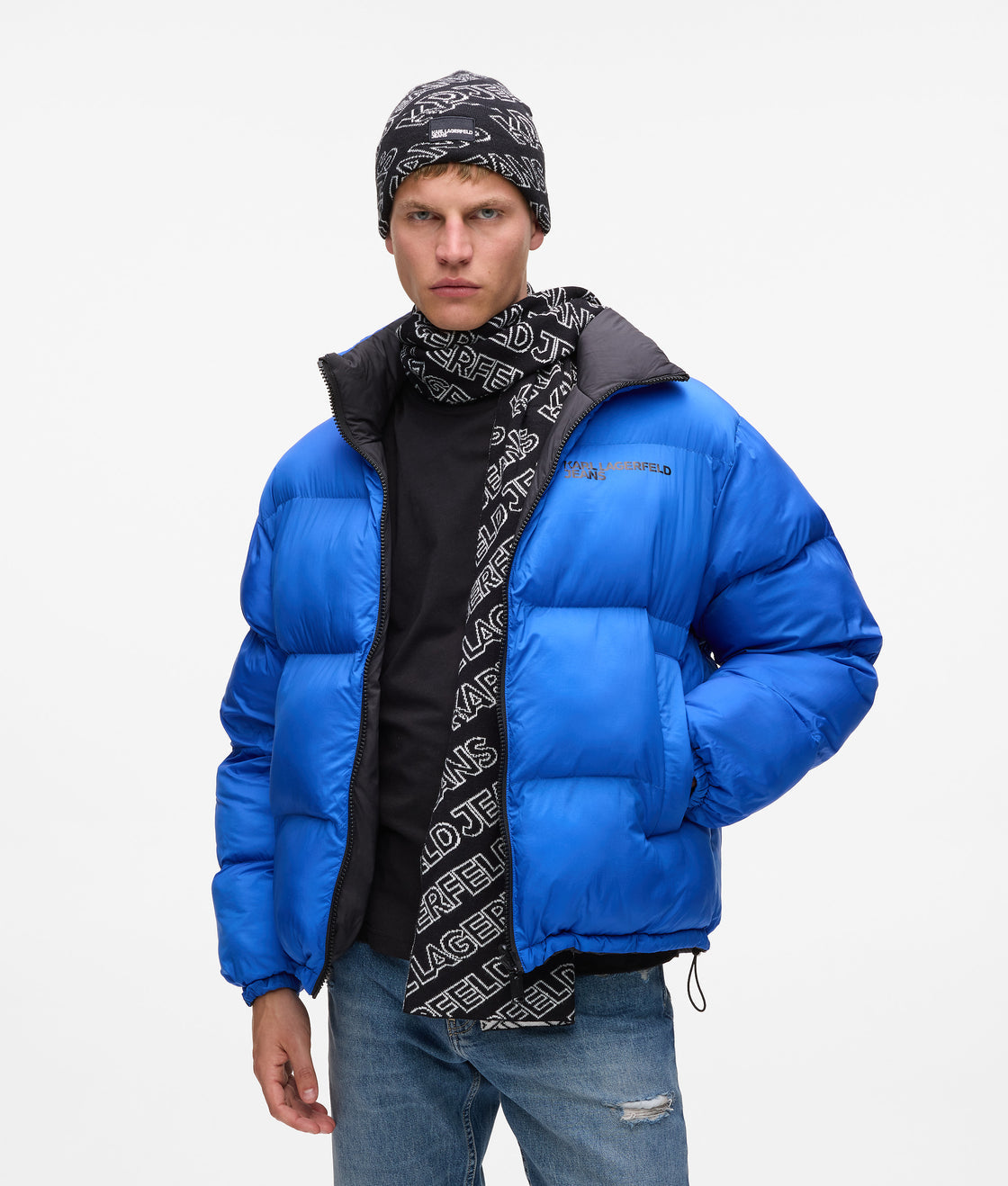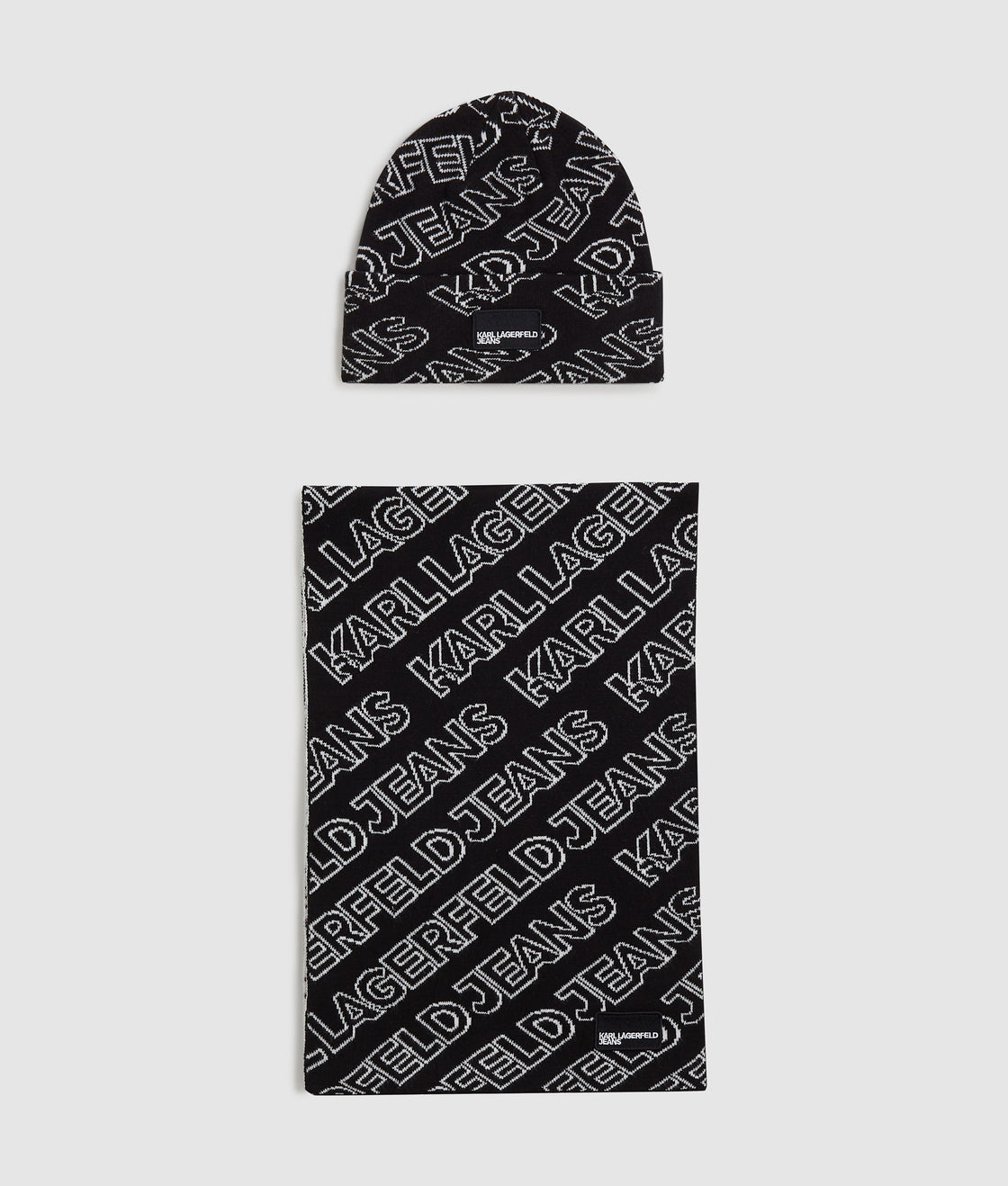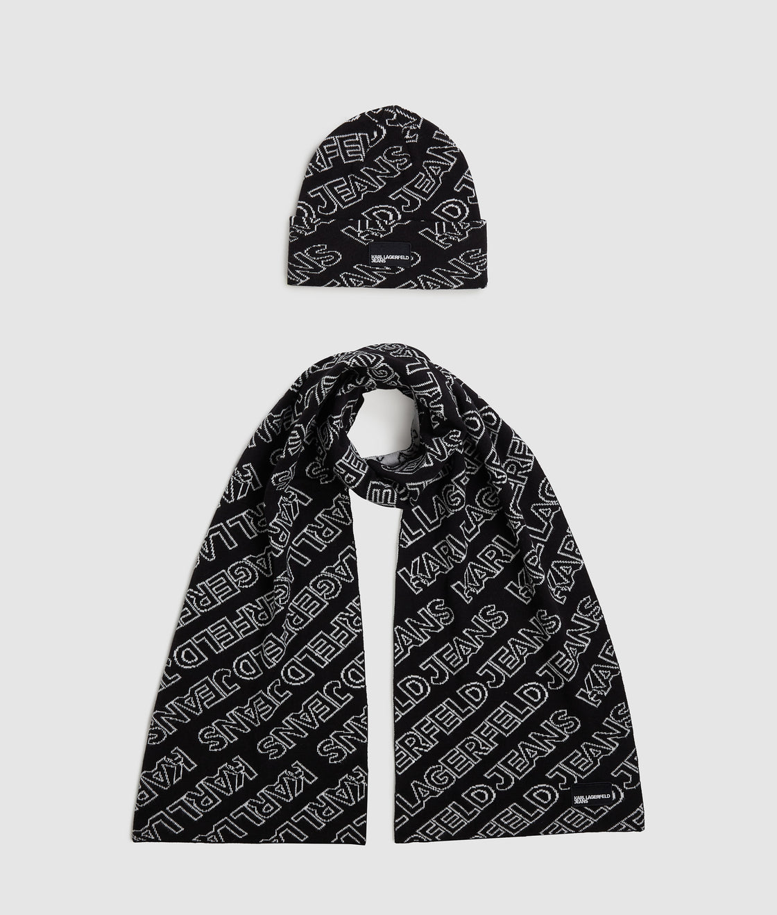 Elevate outdoor wear with this contemporary set, featuring a long-length scarf and folded brim beanie embellished with a bold, all-over KARL LAGERFELD JEANS logo design. Perfectly presented in a signature gift box.