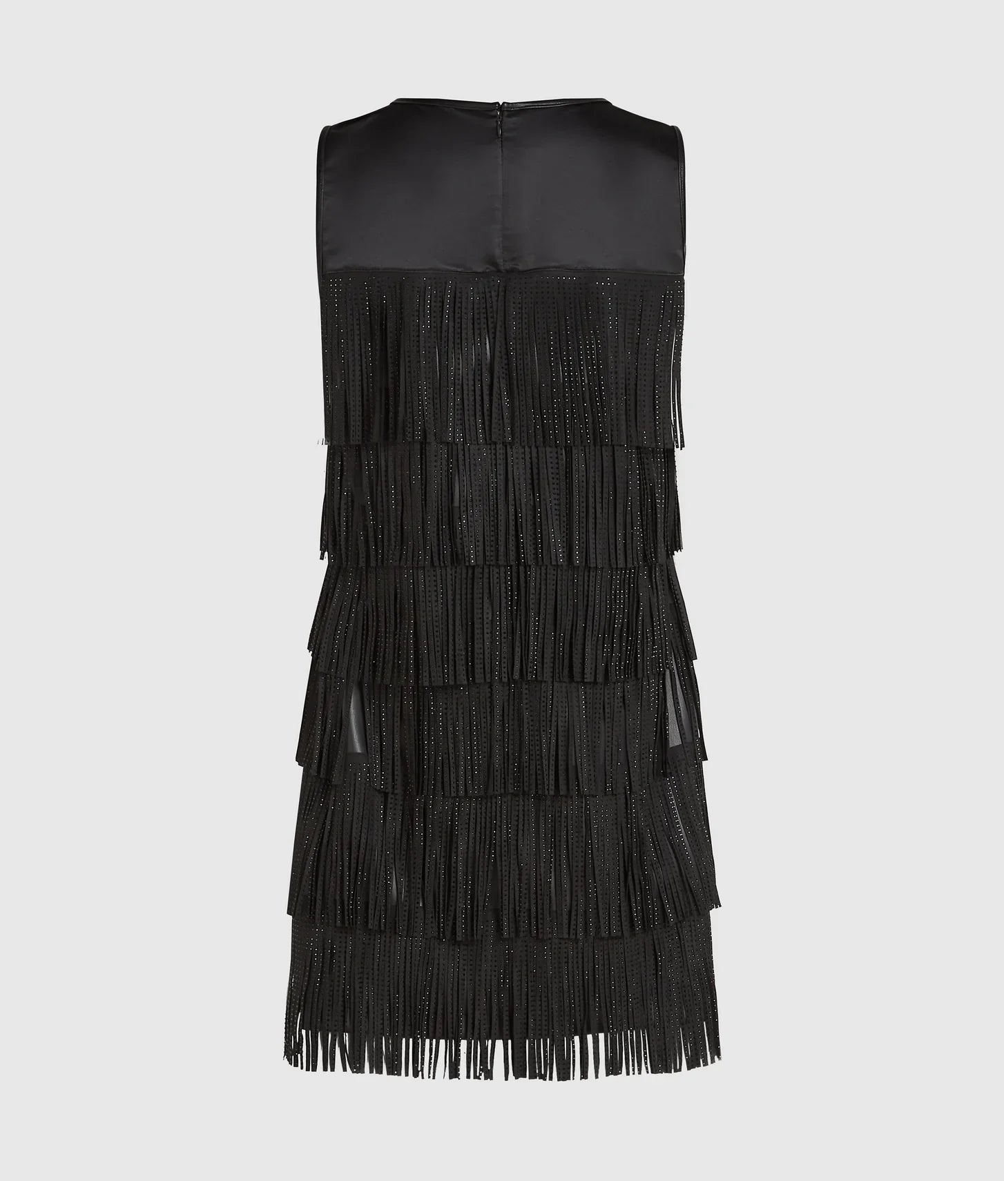 • Playful faux-leather fringe throughout the dress for movement and texture