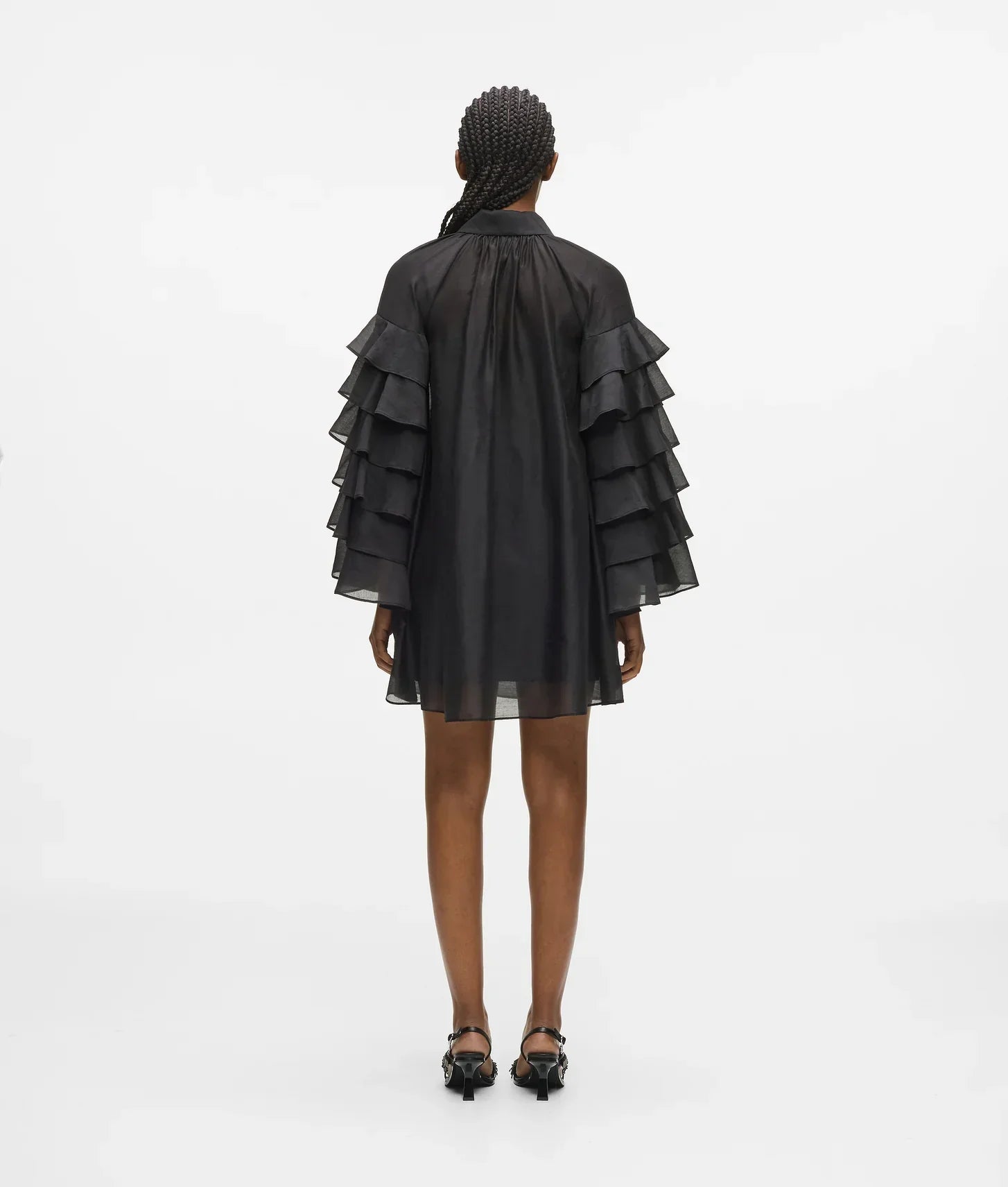 Make a bold yet sophisticated statement with the Ruffled Sleeves Dress, a sheer silhouette designed to blend drama with versatility. Crafted from a lightweight 85% Tencel and 15% polyester woven fabric, the dress features cascading multi-layered ruffled sleeves that create movement and a feminine, voluminous profile.