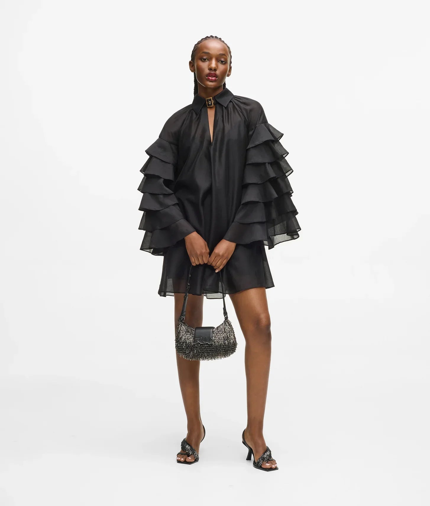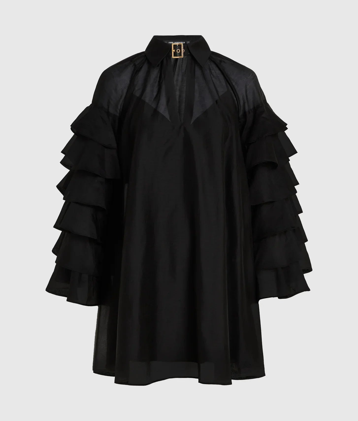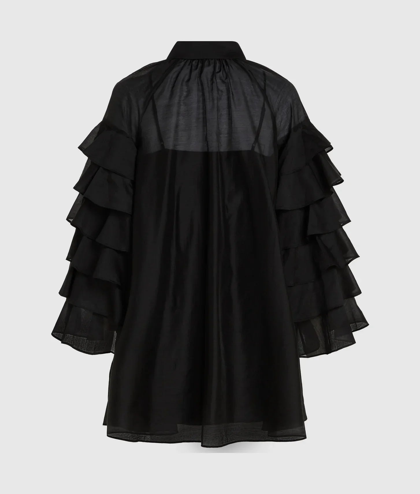 • Voluminous, multi-layered ruffled sleeves for movement and drama