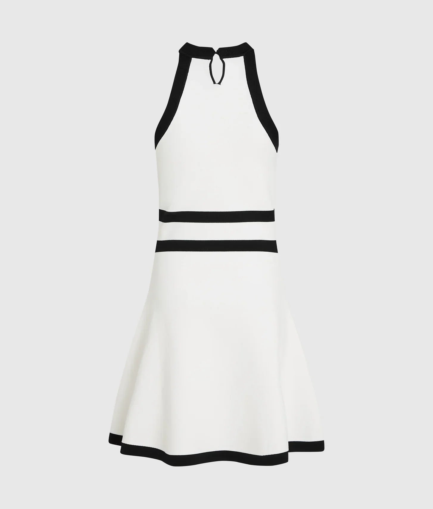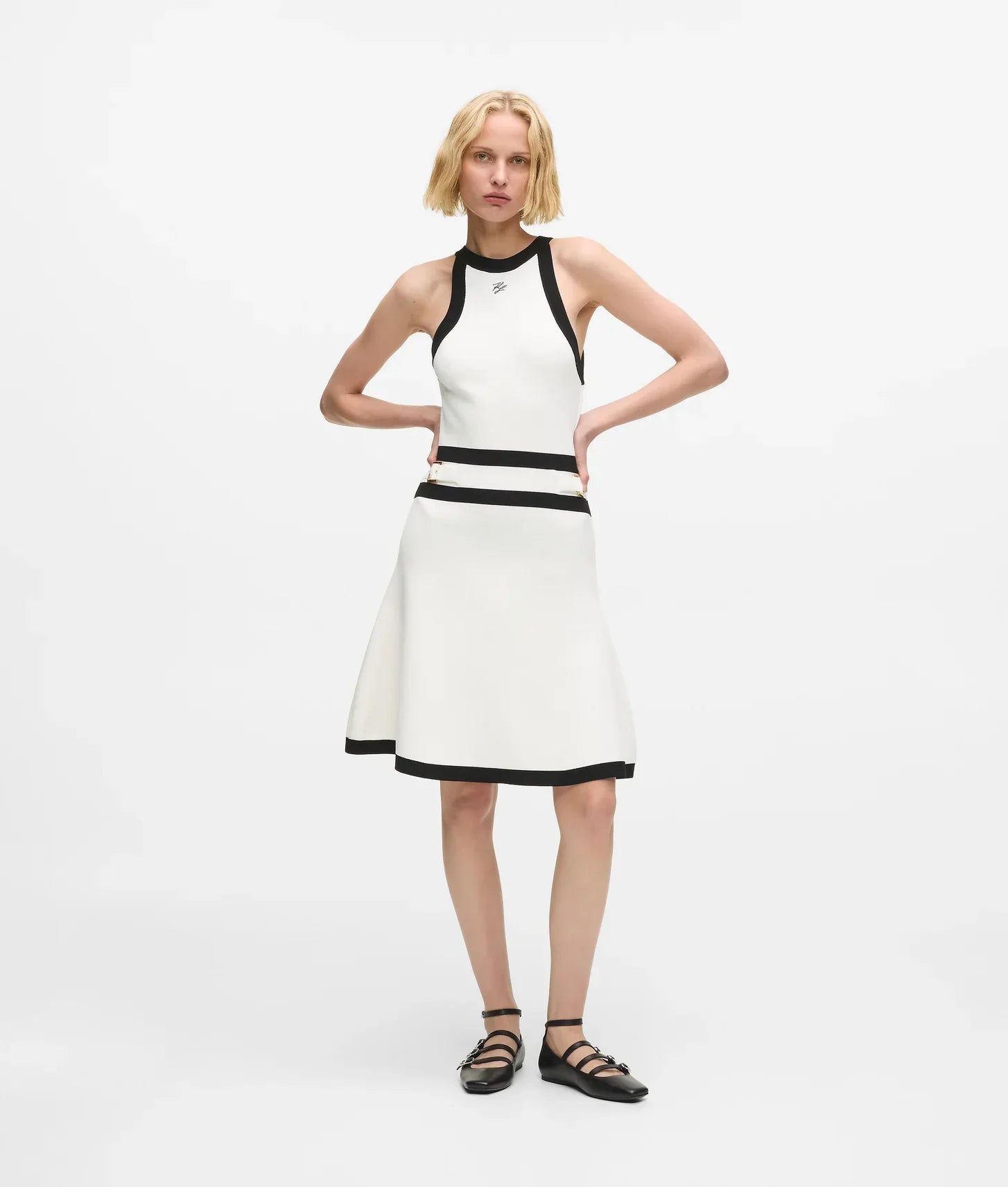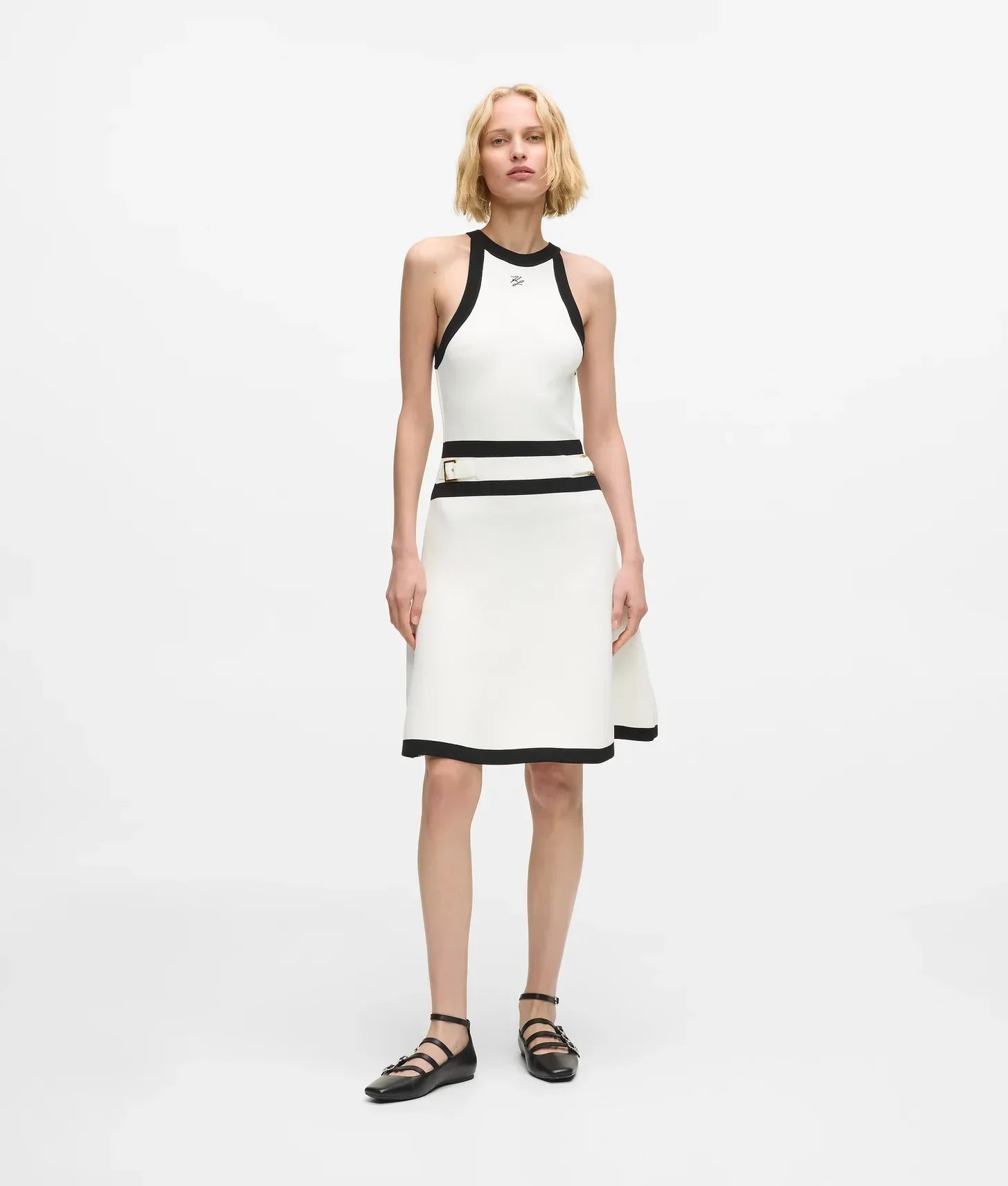 The black piping at the armholes, neckline, waist, and hem emphasizes the structured design, while a functional buckle at the waist cinches the silhouette, highlighting the figure with subtle elegance. The embroidered Karl Autograph logo at the chest adds a signature branding touch, and the keyhole back detail brings refined sophistication to the overall look.