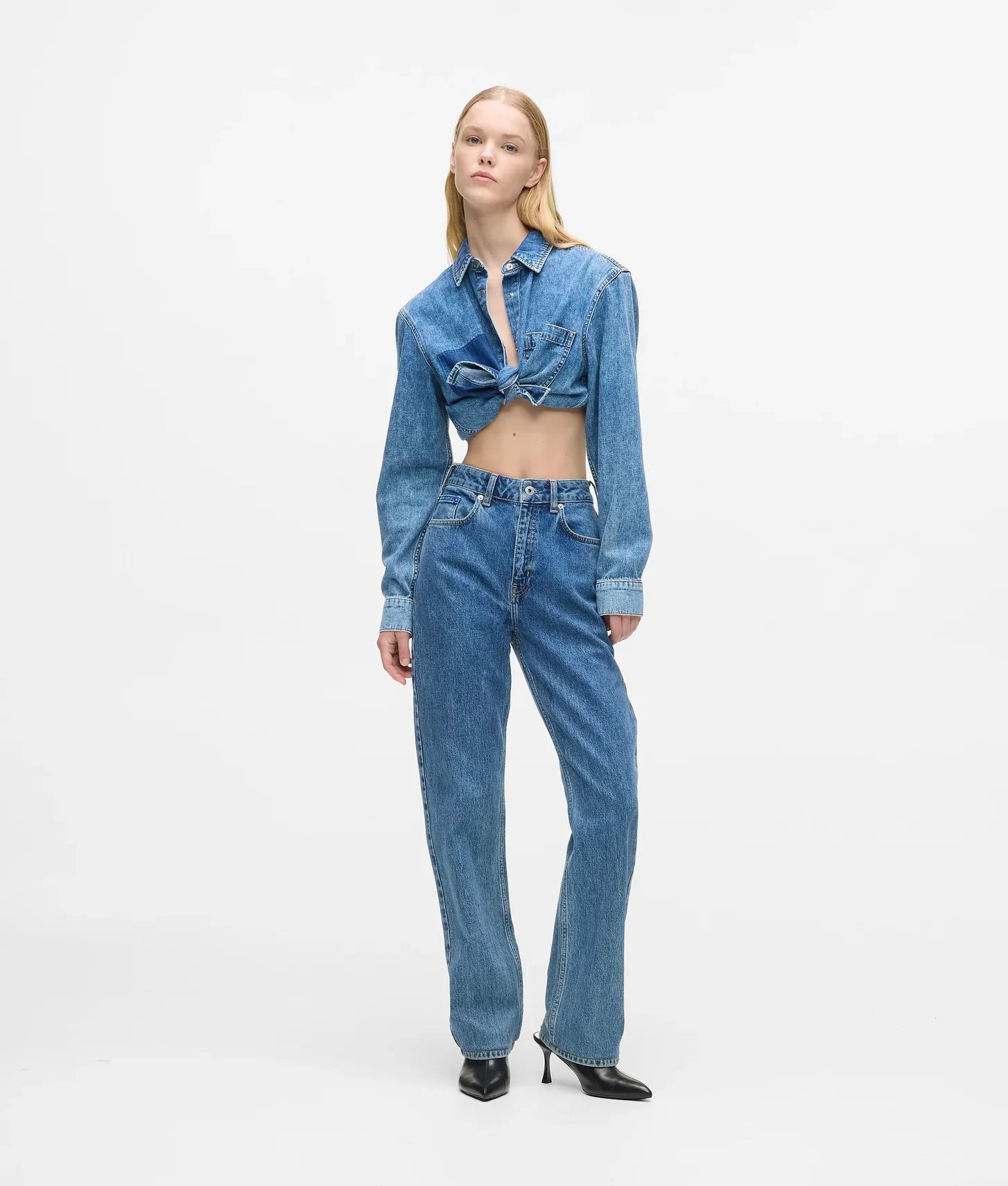 Signature KARL LAGERFELD JEANS details elevate the design, including a branded shank button at the fly closure, a leather logo patch at the back waistband, and distinctive blue K-initial embroidery at the right back pocket corner. These refined accents add a subtle designer edge while keeping the overall look clean and minimal.