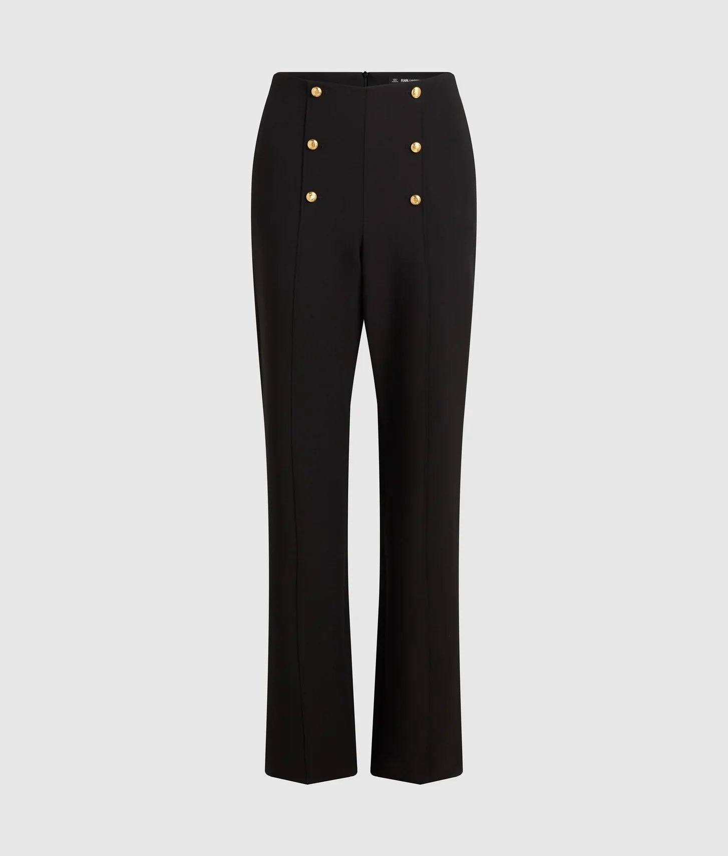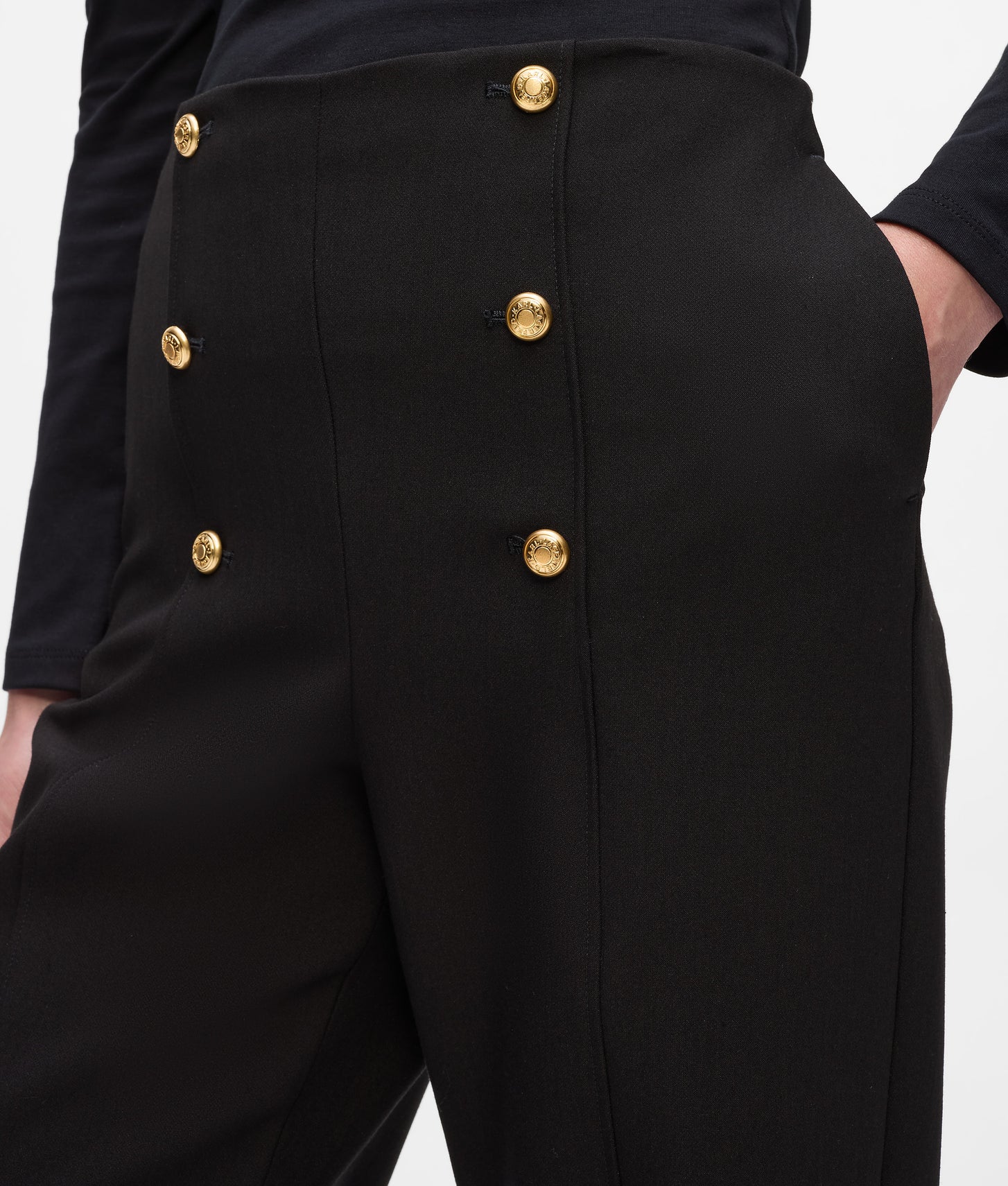 Designed with a clean, streamlined fit, they feature an invisible zip closure at the center back, ensuring a smooth finish and a flattering waistline. Functional side pockets and back welt pockets add practicality without compromising the tailored aesthetic. At the front, gleaming gold branded buttons provide a striking focal point, introducing a touch of vintage-inspired charm that elevates the overall design.