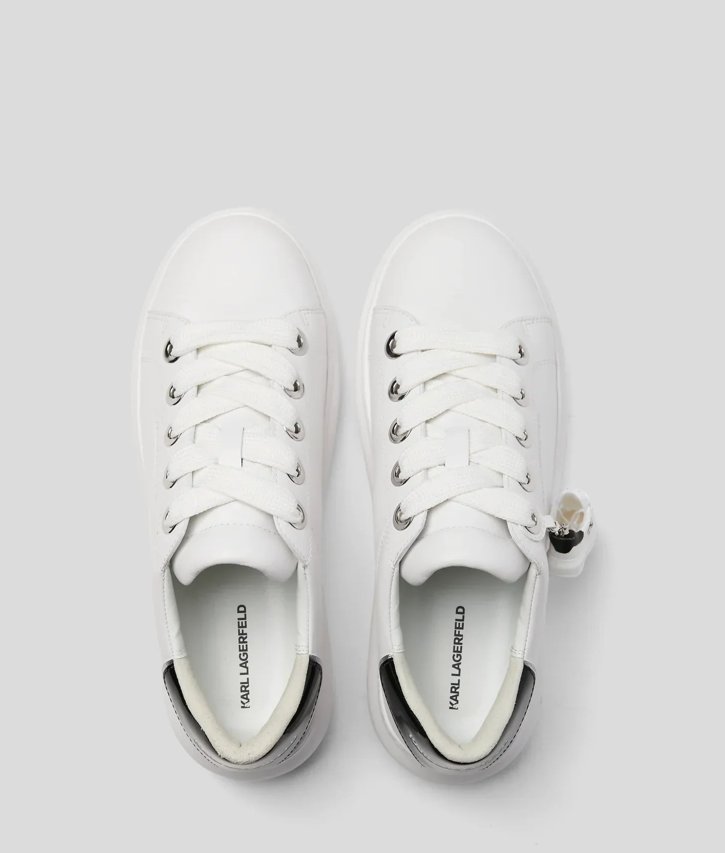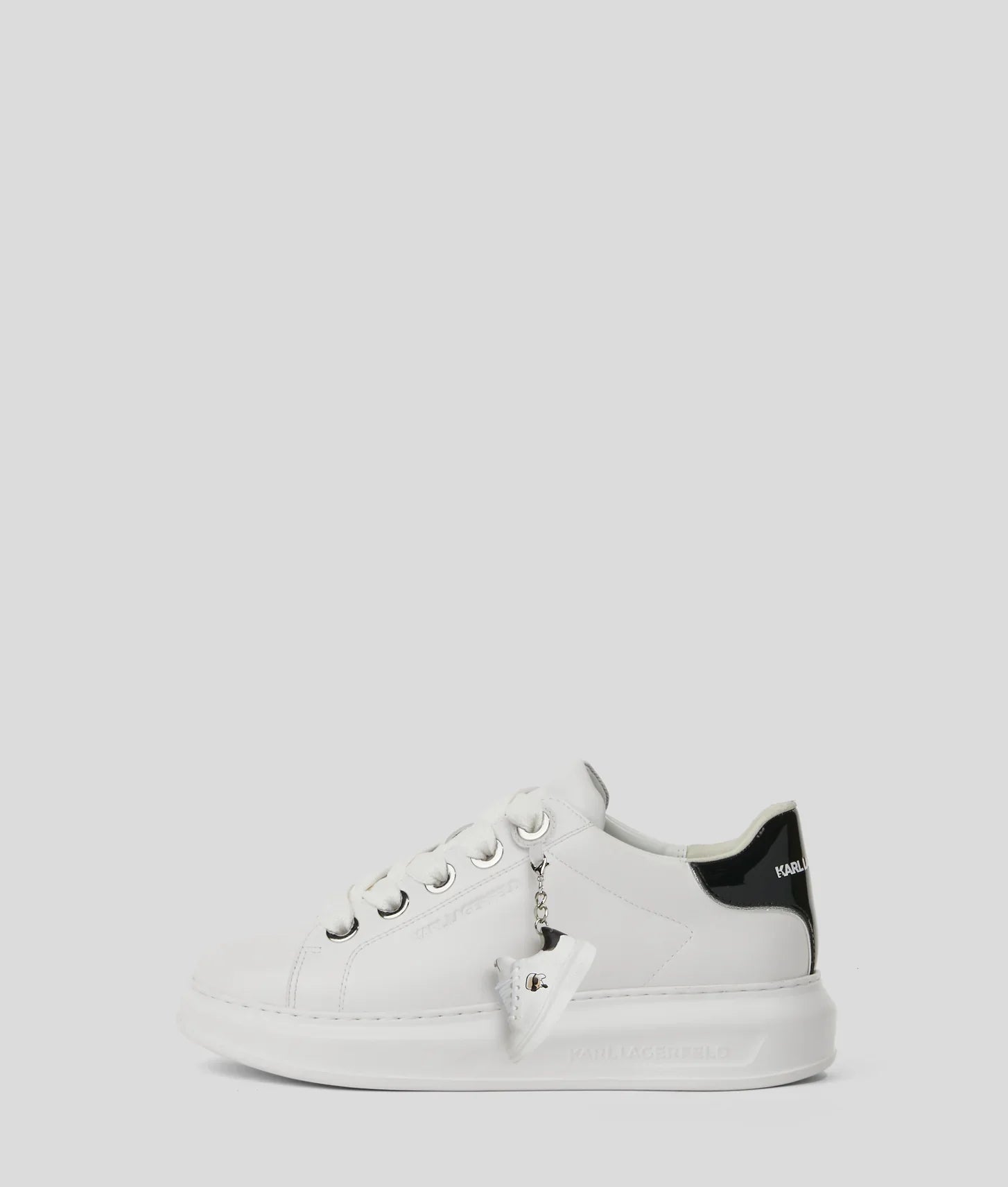 A contrasting heel counter, stamped with the unmistakable KARL LAGERFELD logo, elevates the sneaker’s clean profile, adding definition and a touch of designer sophistication. What truly sets this pair apart is the miniature sneaker charm, a whimsical accessory that celebrates individuality and Karl’s love for iconic details. Whether kept on for flair or detached for a subtle look, the charm brings a unique personality to the design.